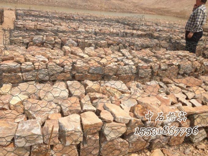 格賓網箱填充料塊石粒徑應控制在8~25cm的占80%以上,其余20%為級配好的碎石。